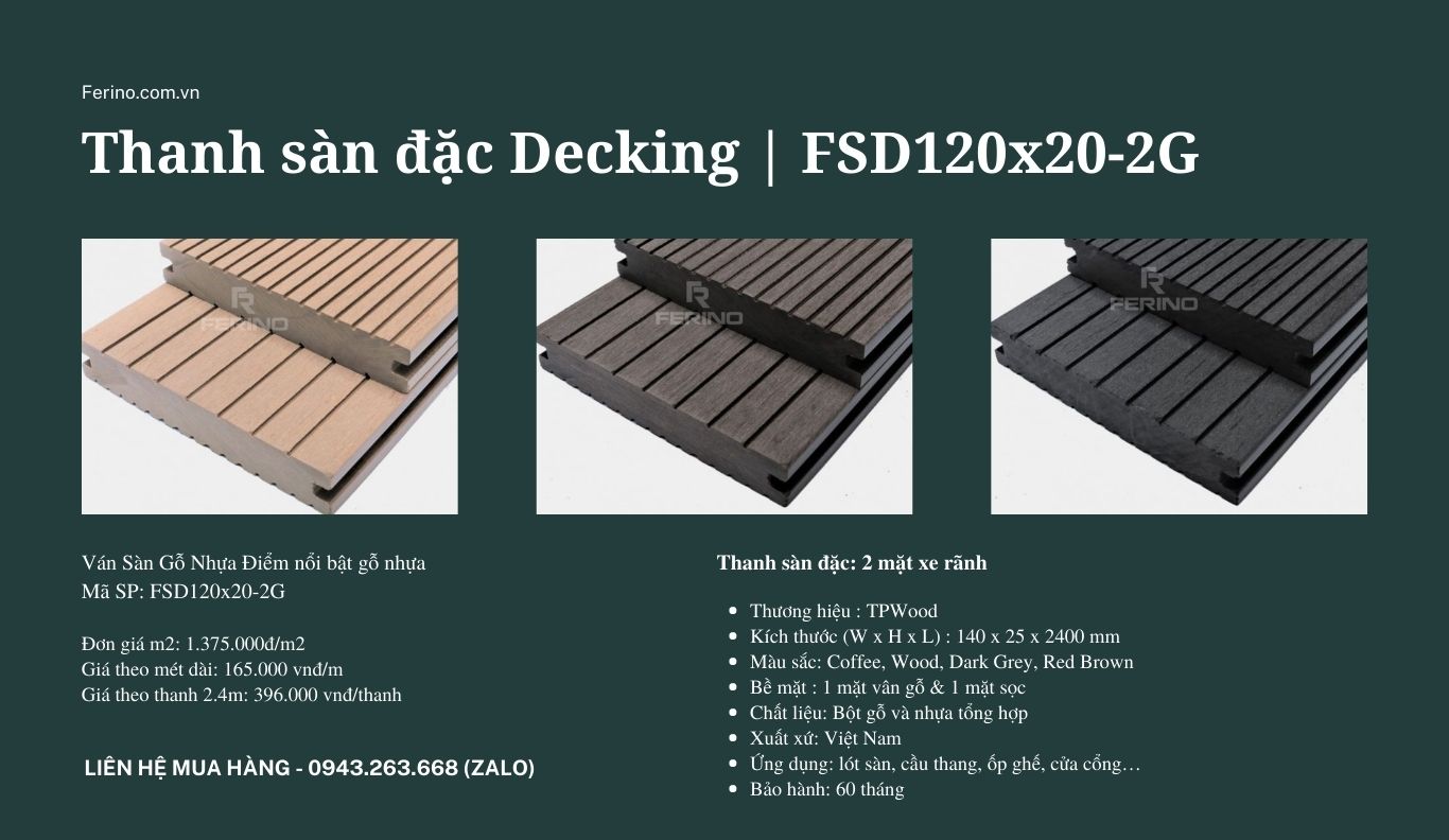 Sàn Gỗ nhựa Ngoài Trời composite hiện đang là loại vật liệu trang trí ngoại thất, nội thất được đông đảo khách hàng quan tâm bởi ứng dụng đa dạng, độ bền vượt trội và giá trị thẩm mỹ cao. Ferino xin gửi tới quý khách bảng báo giá gỗ nhựa composite mới nhất.