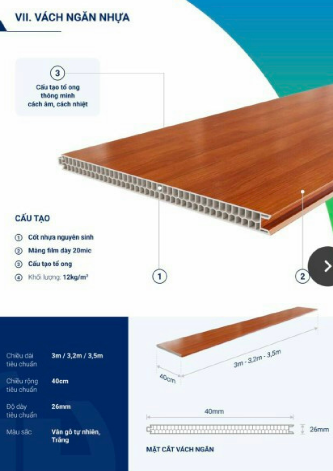 Vách nhựa giả gỗ là vật ngăn cách, phân chia các khu vực với nhau để tạo ra những không gian làm việc cụ thể. Có hai loại vách ngăn nhựa giả gỗ chủ yếu là vách ngăn di động và vách ngăn cố định. Tấm nhựa vân gỗ được sản xuất cho cả hai loại vách ngăn này.