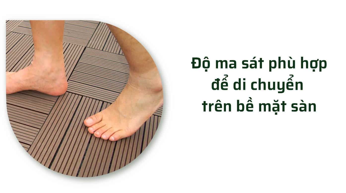 Nhìn và cảm nhận như gỗ tự nhiên, với vỉ gỗ nhựa lát sàn thì đi rất êm chân ngoài ra với thiết kế rảnh và vân gỗ tăng khả năng chông trơn trượt thậm chí ngay cả khi mặt sàn còn ướt.