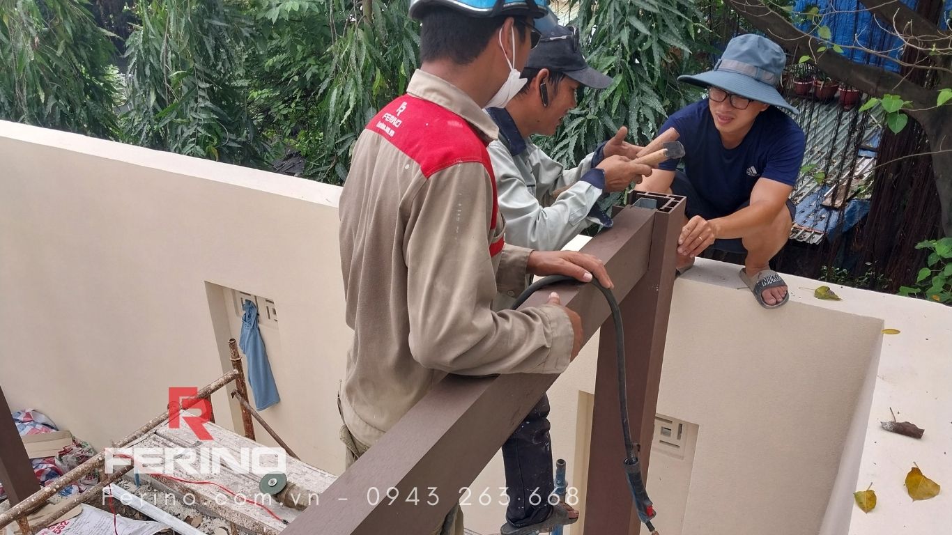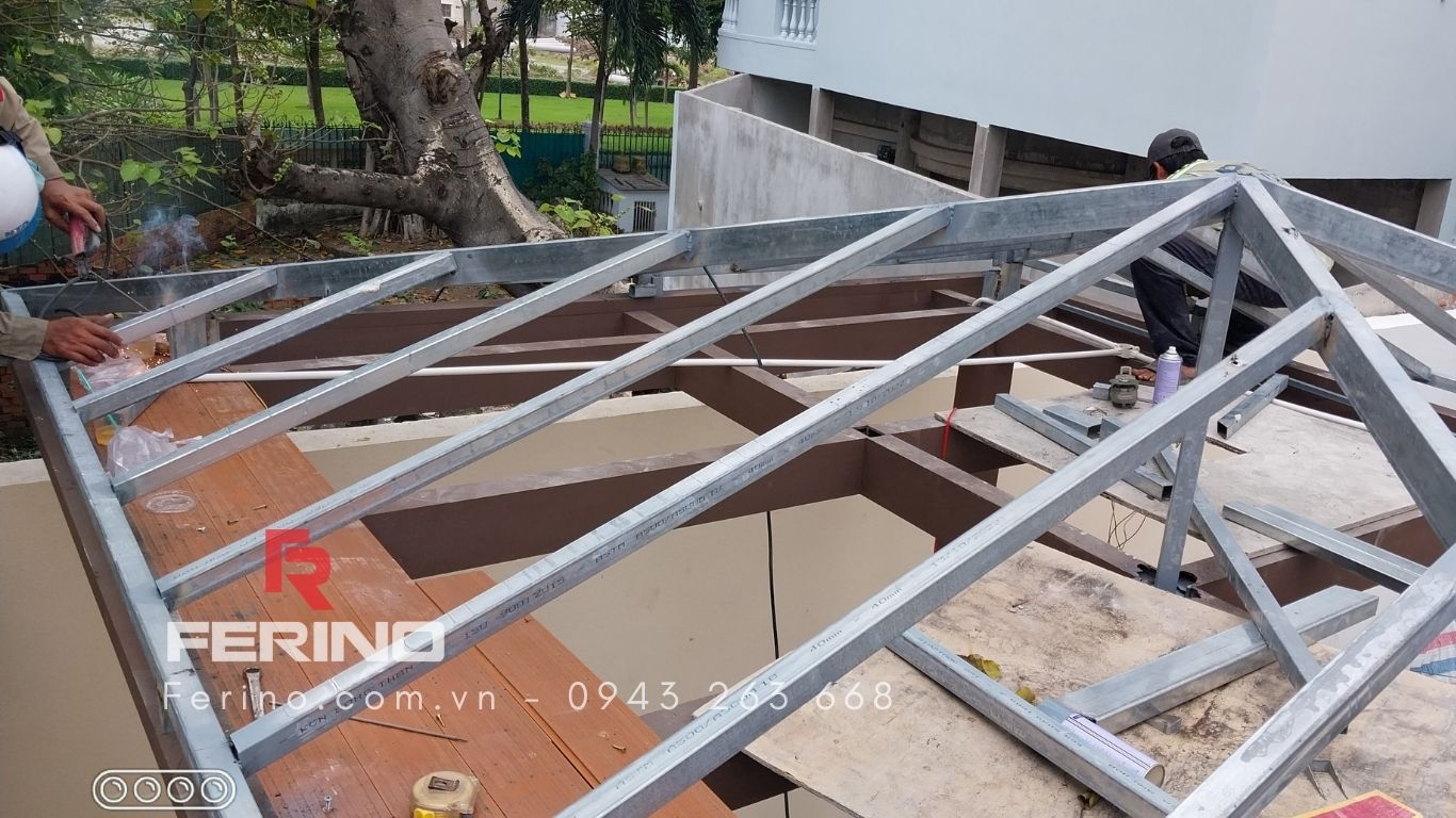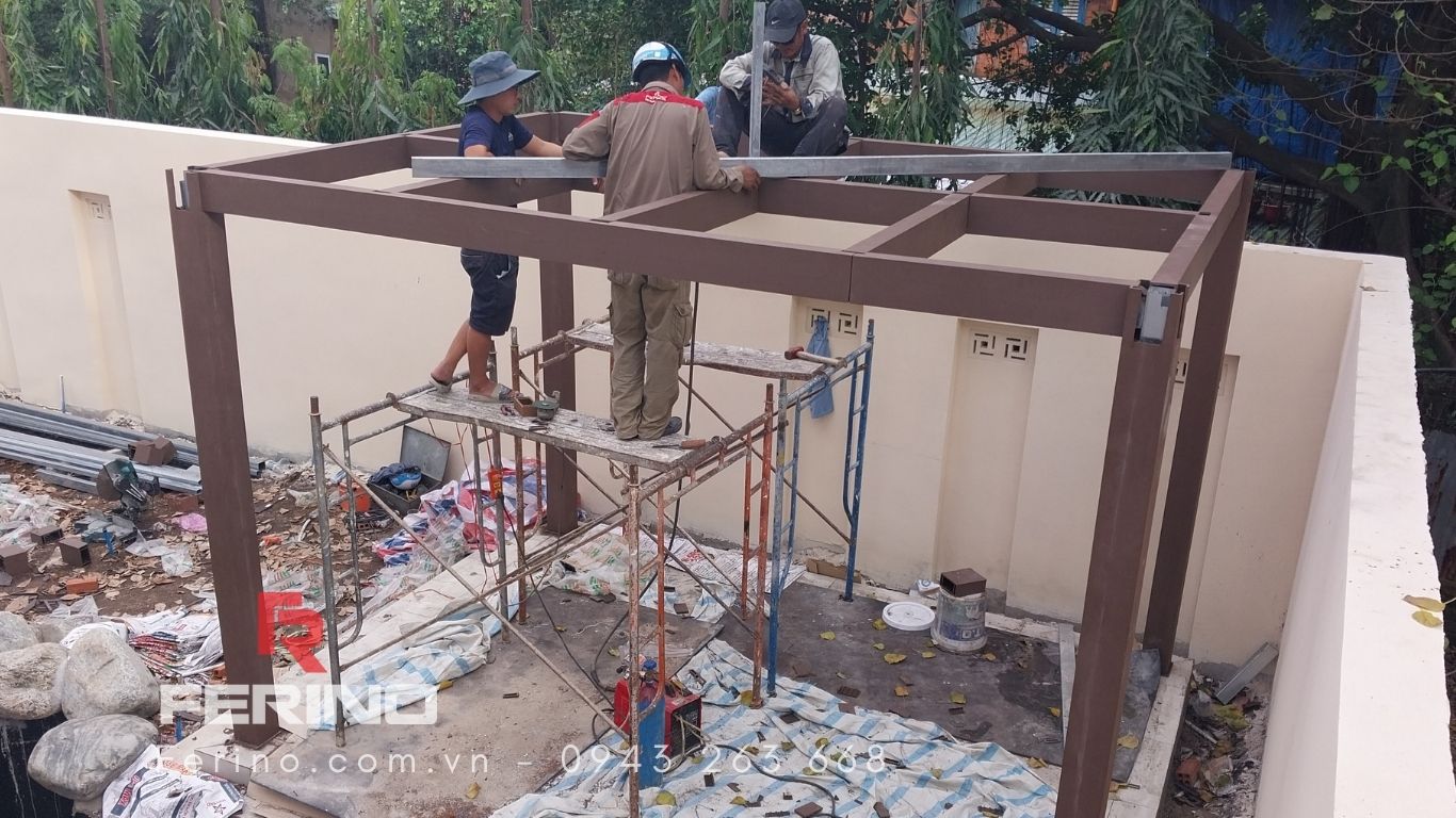 B3: Thi công hệ xà gồ gỗ nhựa theo quy cách , ở công trình này Ferino sử dụng thanh gỗ nhựa quy cách 60x180mm sửa dụng luồn bên trong thanh sắt hộp 50x100x1.8mm liên kết hàn tại các liên kết với cột và các thanh xà gồ