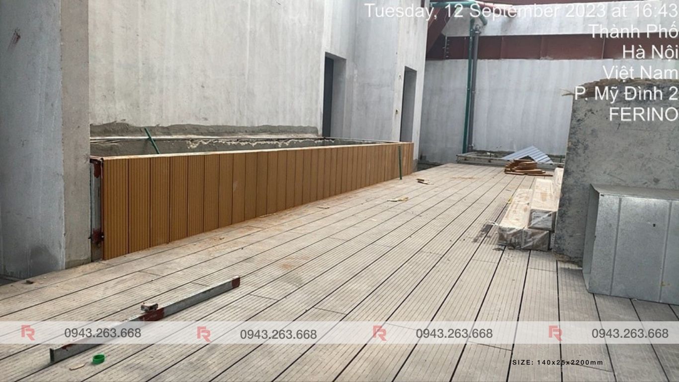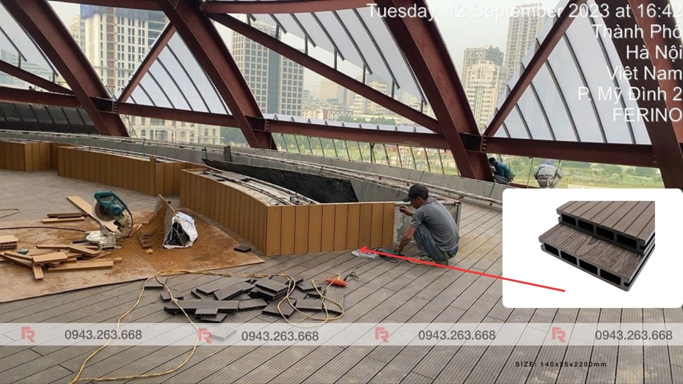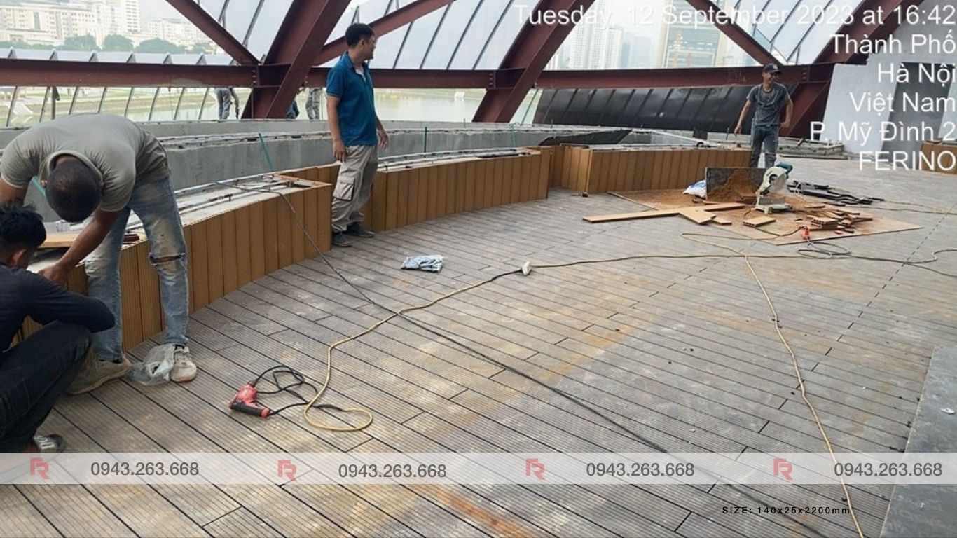 Ngoài việc thi công toàn bộ mặt sàn tầng 7 bằng gỗ nhựa ngoại trời với hệ khung xương sắt hộp 30x30x1.2mm, Ferino còn thực hiện các hạng mục khác như ốp bồn cây tại khu vực tầng 7 và tầng 01. Chúng tôi cũng đã thi công 17 ghế sử dụng gỗ nhựa để ốp bề mặt ghế, tạo nên không gian thoải mái và thẩm mỹ cho Cung Thiếu Nhi Hà Nội.