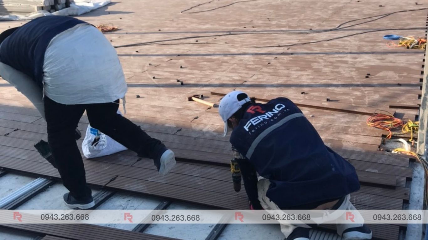 Ferino đã sử dụng sản phẩm sàn gỗ nhựa ngoại trời mã sản phẩm Coffee FR140K25A với kích thước 140mm x 25mm x 2200mm. Sản phẩm này mang thương hiệu của Ferino, một thương hiệu uy tín và chất lượng trong lĩnh vực sàn gỗ nhựa.